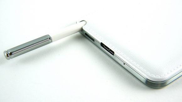 Він не тільки допомагає утримувати смартфон в руці, але і дійсно по відчуттях нагадує шкіру. Той же пластик використовується в S Pen, слот для якого розташований на нижній межі. Там же, на нижній межі, знаходиться слот роз'єму USB 3.0. Galaxy Note 3 - перший телефон, в якому використовується подібний коннектор, він допомагає швидше заряджати пристрій і передавати інформацію з комп'ютера. Для підключення можна використовувати звичайний кабель microUSB.
