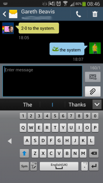 Додаток для написання СМС здасться знайомим всім, хто користувався операційною системою Android раніше, але і для новачків воно не здасться чимось незрозумілим. Galaxy Note 3 додає фотографії профілю абонентів з Телефонного книги до стрічки повідомлень, цю можливість можна зустріти не у всіх сучасних смартфонах. Додаток можна запустити і зі сторінки контакту в Телефонного книзі, провівши пальцем справа наліво по імені абонента. До повідомлень можна додавати фотографію або відео.