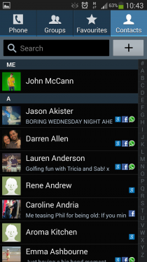 Інтерфейс Samsung TouchWiz завжди був хороший в плані соціальної інтеграції, це триває і в Galaxy Note 3. В додаток Контакти поміщається інформація не тільки з SIM-карти, але і з ваших акаунтів електронної пошти та соціальних сервісів (крім Twitter) . Картинки до контактів додаються з Facebook і Google+. З'єднання контактів з їх профілем в соціальних мережах проходить автоматично, але якщо ім'я вашого друга відрізняється, то можна зробити це вручну. Зателефонувати абоненту можна, провівши зліва на право по його імені.