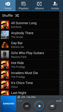 Зверху екрана знаходиться повзунок управління звуком і налаштування передачі даних з музичного плеєра на інші пристрої. В меню є і додаткові функції, такі як: можливість виведення звуку на Bluetooth гарнітуру або навушники, відправка музики інших пристроїв Note 3 і Galaxy S4 через Group Play і установка поточного треку як рингтон. Натиснувши на кнопку меню, ви отримаєте більше опцій, включаючи різні установки звуку через SoundAlive, швидкість відтворення, а також можливість завантажити текст пісні. Функція розумного звуку обробить кожен трек і переконається в тому, що вони всі будуть мати однакову гучність. Керувати музичним додатком можна і з екрану блокування.