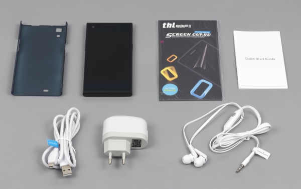 THL T100S поставляється в комплекті із зарядним пристроєм (1 ампер), захисною плівкою для екрану, стереогарнитурой вакуумного типу, інтерфейсним кабелем, рекламною брошурою і захисним чохлом, виконаним з м'якого пластику з прогумованим покриттям. Захисний «бампер» зроблений не дуже якісно. Він нещільно прилягає до тильної панелі смартфона.