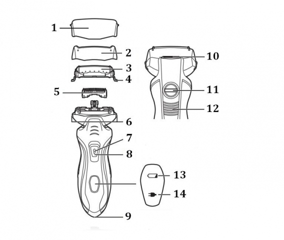 14 - індикатор поточного стану зарядки електробритви.