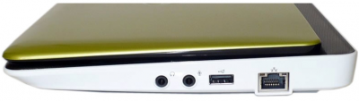 справа: 3,5 мм порти для навушників і мікрофону, USB, LAN