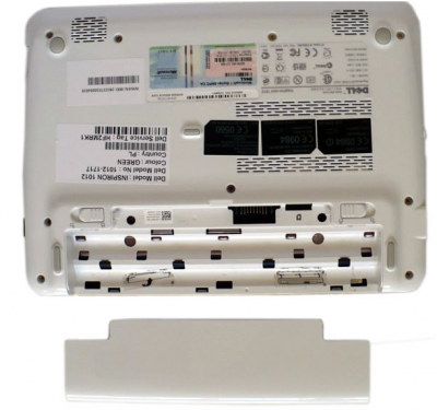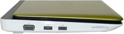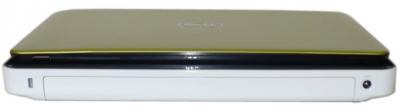 Сверкают також боку Inspiron, які разом з низом виконані з одного пластику. Має він білий колір зі згаданим блиском. На мій погляд, це не найкраще рішення для кольору низу мобільного устаткування, яке часом, напевно, буде стояти не в дуже чистому місці. Скорочено - я не передбачаю цьому елементу довгий чисте і бездоганне майбутнє. Однак таке поєднання - білий низ і кольоровий покрив в невеликому Dell виглядає дуже красиво. Нижня частина, хоч колоритно неділова, але має, проте інші переваги для користування, тому що дуже міцна і ніде не прогинається.