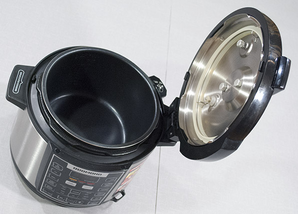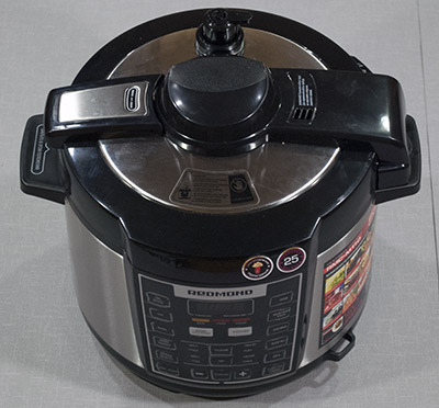 Мультиварка Redmond RMC-M110 з дорогих моделей. На перший погляд - вона звичайна, класична - кругла, сріблястого кольору, з чорною кришкою і безліччю кнопок. Але це всього лише зовнішній вигляд. Вже згадана модель - мультиварка-скороварка. Це означає, що вона готує під тиском, за рахунок якого знижується час приготування страв.