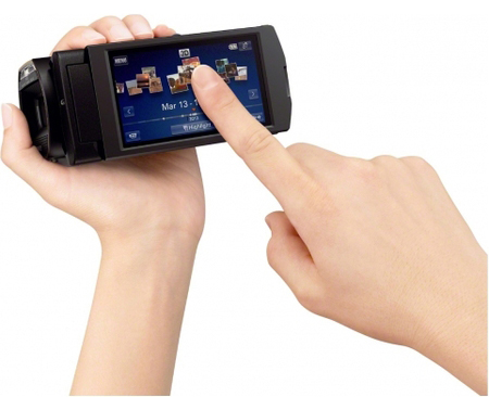 Особливо сподобався дисплей відеокамери. Його розмір становить 8,8 см (3,5 дюйма) з співвідношенням сторін 16: 9, а загальна кількість пікселів дорівнює 1229760 (480х2562 пікселів). Цього більш ніж достатньо для комфортного використання відеокамери. Але при першому знайомстві відразу ж вражає здатність даного екрану легко повертатися під потрібним кутом і навіть розвертатися на 180 градусів для зручного перегляду відзнятого матеріалу. При цьому поворот здійснюється плавно і не вимагає докладати ніяких зусиль. А оскільки екран є ще і сенсорним, то під час зйомки може значно полегшити настройку камери або навіть наведення фокусування на об'єкт зйомки одним простим дотиком до дисплея. Така його особливість, безумовно, показала себе на практиці дуже корисною і практичною. Крім того, при закритті екрану відеокамера вимикається, а при відкритті автоматично включається, що значно скорочує час на підготовку камери до зйомки і дозволяє почати запис в будь-який зручний момент.