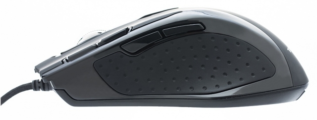 Деталі корпусу виконані з пластика, що має різну текстуру. Лицьова панель виготовлена ??з матового матеріалу. Тактильні відчуття від нього приємними назвати не можна, так як при торканні його шорсткою поверхні виникає враження, що поверхня миші всіяна дрібними піщинками. Якість обробки цього пластика не на висоті, що вкотре підтверджує актуальність застосування при виготовленні маніпуляторів м'якого soft-touch покриття. Єдиною перевагою такої поверхні є хороші вологовідштовхувальні властивості, завдяки якій відбитки від зіпрілій долоні зовсім не помітні. Крім того, це перешкоджає вислизанню миші з руки в динамічних ігрових епізодах.