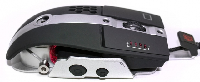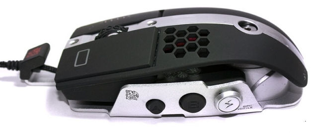 На правої основної клавіші є чотири світлодіодні індикатори червоного кольору. Вони призначені для інформування користувача про зміну ступеня чутливості лазерного датчика. При максимальному значенні dpi все індикатори стають активними. Також справа розташовані програмовані кнопки C і D.