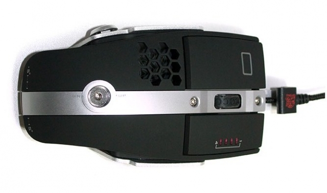Як згадувалося раніше, на спинці миші розташовано поздовжнє металеве ребро. На ньому розташовано гумове колесо прокрутки. Також там є спеціальний отвір, призначене для регулювання висоти спинки. Для зміни висоти корпусу необхідно скористатися невеликою шестигранною викруткою, що поставляється в комплекті з маніпулятором. Підйом і опускання спинки забезпечує масивна пружина, яка нагадує амортизатор автомобільного колеса. Висота корпусу може коригуватися в межах 5 мм, чого цілком достатньо для адаптації контролера під велику долоню. Механізм дуже надійно фіксує панель в потрібному положенні, тому геймер може не переживати через те, що під час запеклих ігрових баталій болти можуть ослабнути і спинка маніпулятора зрушиться. Кут нахилу верхньої панелі має окреме регулювання. Як і у випадку з коригуванням висоти корпусу, зміна кута нахилу проводиться за допомогою шестигранної викрутки. Гніздо, що забезпечує доступ до механізму регулювання кута нахилу верхньої панелі, розташоване праворуч. Також спинка маніпулятора має можливість повороту вліво і вправо - її можна повернути на п'ять градусів. Залежно від особистих переваг і за видом хвата, геймер може сам підібрати оптимальне положення спинки для комфортного користування.