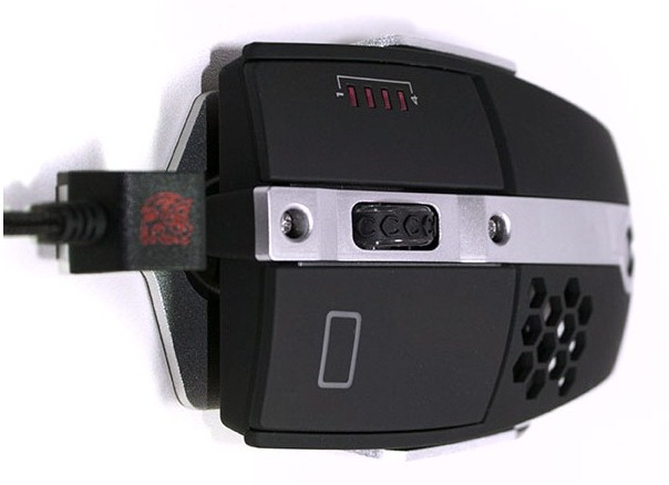 Форму корпусу можна визнати симетричною, проте стверджувати, що контролер однаково добре підійде як правші, так і лівші, не вийде, так як ліва основна клавіша на 5 мм більше, ніж права. Біля лівої клавіші є невелика перфорована область, яка виконує не тільки функції декоративного елемента, але і призначена для підвищення ефективності вентиляції корпусу пристрою. Дванадцять отворів, виконаних у вигляді сот, дають можливість вільного доступу повітря до внутрішніх компонентів миші. Крізь перфоровану зону можна побачити логотип Thermaltake, який має світлодіодне підсвічування.