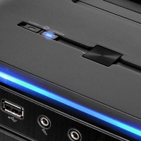 Зверху в один ряд розташувалися кнопки і світлодіодні індикатори. У центрі знаходиться велика квадратна кнопка включення / відключення живлення Power, праворуч - кнопка перезавантаження системи Reset, а зліва - дві невеликі кнопки управління контролером вентиляторів. Індикацію корпусу можна назвати дуже оригінальною. Активація електроживлення супроводжується підсвічуванням кнопок контролера вентиляторів і помірним блакитним світінням індикатора, який розташований трохи правіше кнопки Reset. Робота жорсткого диска супроводжується яскраво-червоним світлом цього ж індикатора, а певний режим контролера - яскраво-блакитною підсвіткою відповідної кнопки. Варто зазначити, що така конфігурація кнопок і світлових індикаторів передбачає явно підлогове розміщення системного блоку, так як при настільному розміщенні побачити їх може лише людина дуже високого зросту. Хоча виробник не забув і про підсвічування спереду - при активації харчування над роз'ємами загоряється яскраво-блакитна смуга, яку зверху не видно.