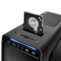 За блоком кнопок і індикаторів розташована док-станція, призначена для під'єднання SATA-накопичувачів. Її роз'єми захищені від пилу подпружиненной шторкою, яка має секції для 2,5- і 3,5-дюймових HDD / SSD. Установка накопичувачів проводиться вертикально, що потрібно врахувати при виборі місця розміщення системного блоку: над ним має залишатися досить вільного простору.