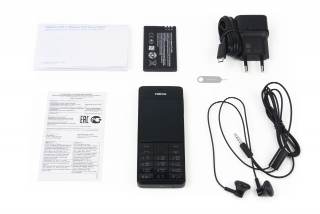 Nokia 515, як і більш дорогі телефони компанії, поставляється в коробці з синього лакованого картону. Однак, на відміну від них, на упаковці зображення телефону не представлено. Крім самого апарату в коробці знаходяться акумулятор, інструкція, гарантійна брошура, мережевий USB-адаптер, інструмент для зняття задньої панелі й провідна гарнітура. В цілому з стандартної, комплектації вибивається тільки скріпка, про корисність якої буде згадано окремо.