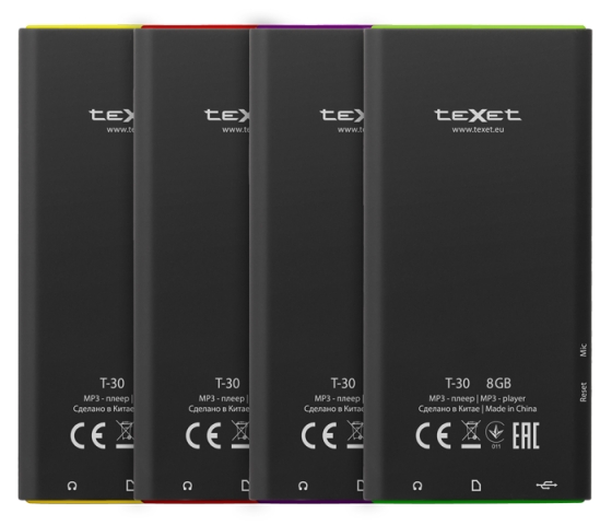 Висота корпусу teXet Т-30 становить 91 міліметр, ширина - 44 міліметри, а товщина - 8 міліметрів. Важить новий MP3-плеєр всього 30,5 грама.