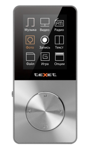 Для управління MP3-плеєром teXet T-60 передбачені чотирьохпозиційний джойстик, кнопка "Меню" і клавіші управління рівнем гучності.